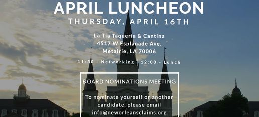 Want to get more involved? Nominations for the Board are accepted throughout the year and, if necessary, runoff elections are held at our April luncheon. To nominate yourself or someone else, please email info@neworleansclaims.org.